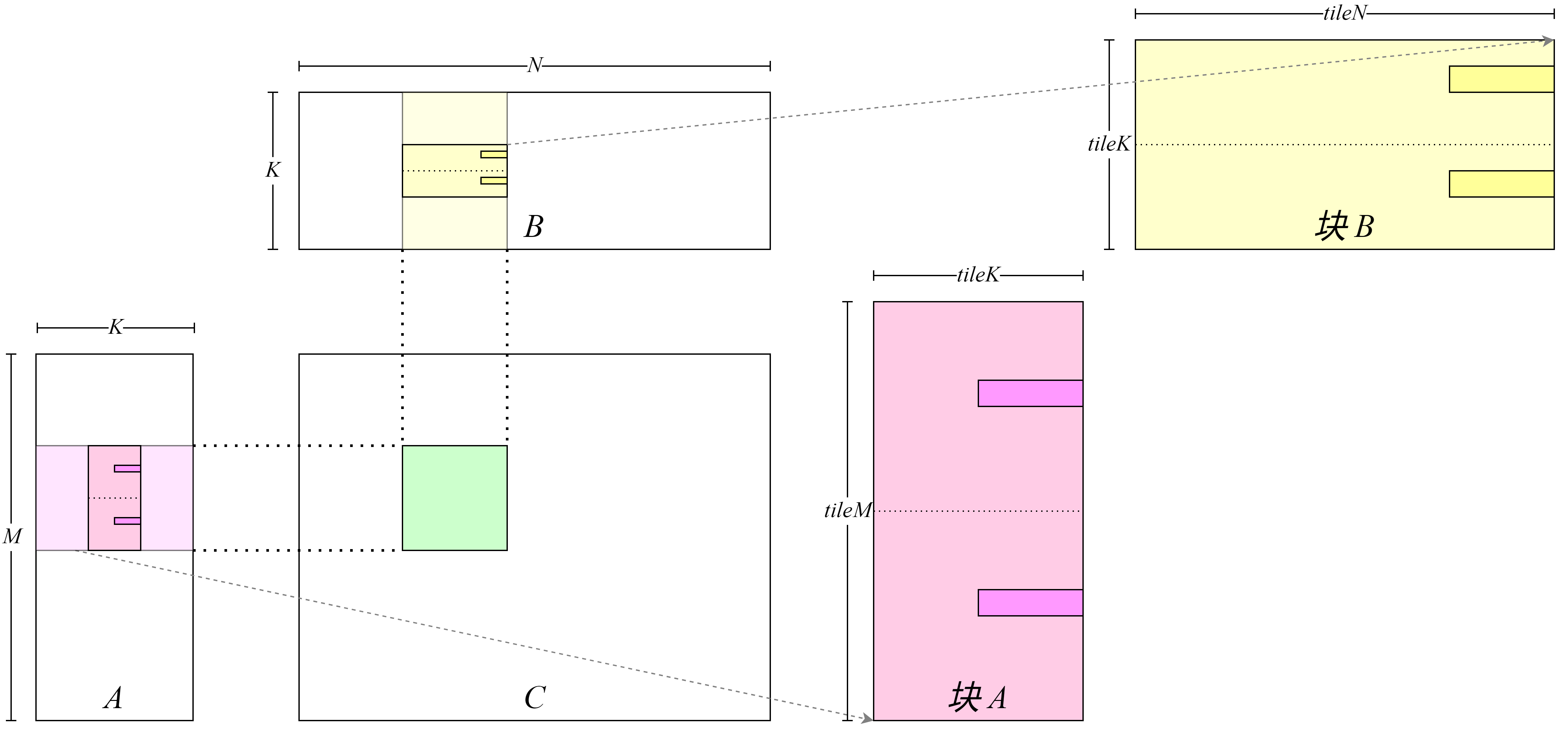 具体地,需要对代码进行如下改造:首先此前代码在计算内积过程是进行\(K\)次循环读取数据并累加计算,在此设定下每次循环中处理矩阵\(C\)中相同行的线程会读取相同的矩阵\(A\)的数据,处理矩阵\(C\)中相同列的线程会读取相同的矩阵\(B\)的数据。可以通过将此\(K\)次循环拆解成两层循环,外层循环\(\frac{K}{tileK}\)次,每次外层循环的迭代读取一整块数据,内层循环\(tileK\)次进行累加数据。数据从全局内存向共享内存的搬运过程如图