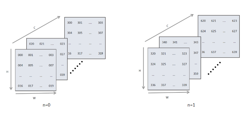 在机器学习系统中常见的数据格式一般有两种,分别为NCHW类型和NHWC类型。其中N代表了数据输入的批大小,C代表了图像的通道,H和W分别代表图像输入的高和宽。图7.3.2展示了BatchSize为2,通道数16和大小为5*4的数据逻辑示意图。