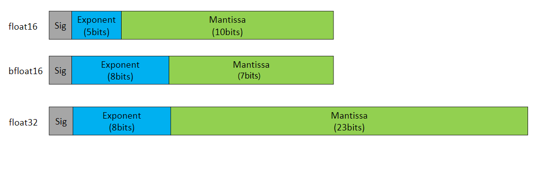 所示。 其中如果指数位全为0时,且尾数位全为0时表示数字0。 如果指数位全为0,尾数位不全为0则表示一个非常小的数值。 当指数全为1,尾数位全为0表示根据符号位正无穷大,或者负无穷大。 若指数全为1,但是尾数位不为0,则表示NAN。 其中bfloat16并不属于一个通用的数据类型,是Google提出的一种特殊的类型,现在一般只在一些TPU上训练使用,其指数位数与float32位数保持一致,可以较快的与float32进行数据转换。由于bfloat16并不是一种通用类型,IEEE中也并没有提出该类型的标准。