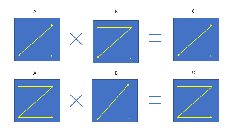 机器学习系统中很多运算都会转换成为矩阵的乘法,例如卷积运算。我们知道矩阵乘法\(A\times B = C\) 是以A的一行乘以B的一列求和后得到C的一个元素。以 图7.3.1为例,在 图7.3.1的上方,矩阵数据的存储是按照行优先来进行存储,虽然B在存储时是按照行存储,但是读取数据时却按照列进行读取,假如我们能把B的格式进行转换转换为列存储,例如 图7.3.1下方所示,这样就可以通过访问连续内存的方式加快数据访问速度进而提升运算速度。由此可见不同的数据排布方式对性能有很大影响。