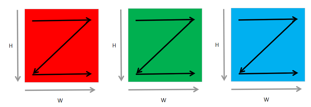 类似的NHWC数据格式是先取C方向数据,再取W方向,然后是H方向,最后取N方向。NHWC是Tensorflow默认的数据格式。这种格式在PyTorch中称为Channel-Last。