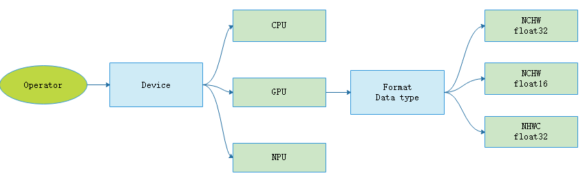 前面讲述了数据格式和数据精度的概念,基于这两个概念,在不同硬件下会有不同的算子支持,一个硬件上支持的所有算子的集合定义为该硬件的算子信息库。算子选择过程就是从算子信息库中选择最合适算子的过程。