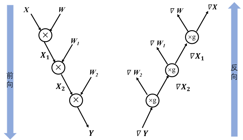 公式 (4.2.6) 在计算 \(\boldsymbol{W_1}\) 的梯度值时使用到了前向图中的中间结果 \(\boldsymbol{X_1}\) 。公式 (4.2.7) 中不仅使用输入数据 \(\boldsymbol{X}\) 来进行梯度计算,参数 \(\boldsymbol{W_1}\) 也参与了参数 \(\boldsymbol{W}\) 的梯度值计算。因此可以回答第一个疑问,参与计算图中参数的梯度信息计算过程的不仅有后序网络层传递而来的梯度信息,还包含有前向计算中的中间结果和参数数值。