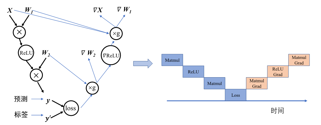 首先从微观上来分析计算图内部的串行调度。计算图中大多数算子之间存在直接依赖或者间接依赖关系,具有依赖关系的算子间任务调度则必定存在执行前后的时间顺序。如 图4.4.2,计算图接受输入数据进行前向计算得到预测值,计算损失函数进行反向梯度计算,整体代码流程后序算子的计算有赖于前序算子的输出。此时算子的执行队列只能以串行的方式进行调度,保证算子都能正确接受到输入数据,才能完成计算图的一次完整执行。