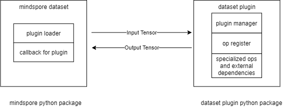 对于用户传入map、filter等数据集变换算子中的自定义数据处理算子,MindData的Pipeline启动后会通过创建的Python运行时来执行。需要指出的是自定义的Python算子需要保证输入、输出均是numpy.ndarray类型。具体执行过程中,当MindData的Pipeline的数据集变换中执行用户自定义的PyFunc算子时,会将输入数据以numpy.ndarray的类型传递给用户的PyFunc,自定义算子执行完毕后再以numpy.ndarray返回给MindData,在此期间,正在执行的数据集变换算子(如map、filter等)负责该PyFunc的运行时生命周期及异常判断。如果用户追求更高的性能,MindData也支持用户自定义C算子。dataset-plugin仓(插件仓) () 为MindData的算子插件仓,囊括了为特定领域(遥感,医疗,气象等)量身制作的算子,该仓承载MindData的插件能力扩展,为用户编写MindData的新算子提供了便捷易用的入口,用户通过编写算子、编译、安装插件步骤,然后就可以在MindData Pipeline的map操作中使用新开发的算子。