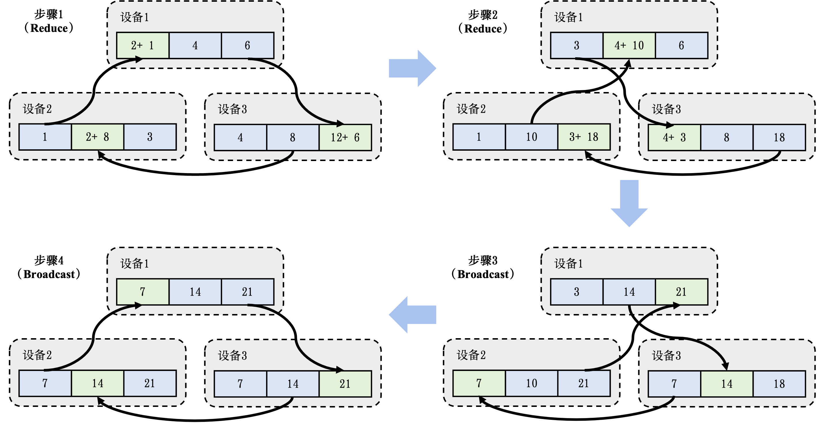 在接下来的Reduce算子中,AllReduce算法会对不同数据分区选择另外的配对方法。例如,在 图11.5.2 的第二个Reduce算子中,AllReduce算法会将设备1和设备3进行配对,负责分区1的数据相加。将设备1和设备2进行配对,负责分区2。将设备2和设备3进行配对,负责分区3。在一个3个节点的AllReduce集群里,在2个Reduce算子完成后,就计算出了每个分区的数据相加结果(分区1的数据相加结果7此时在设备3上,分区2的数据相加结果14此时在设备1上,分区3的数据相加结果21此时在设备2上)。
