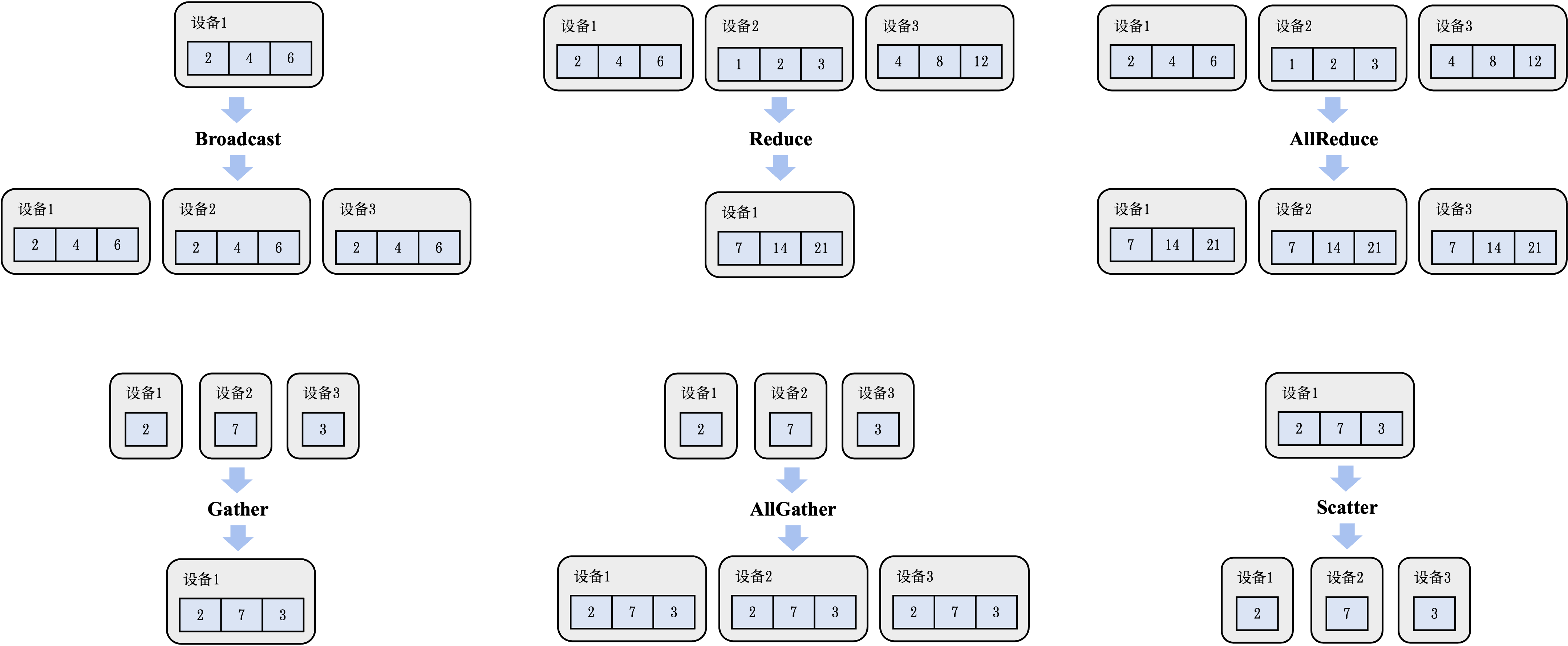 下面首先定义一个简化的集合通信模型,然后引入常见的集合通信算子:Broadcast、Reduce、AllGather、Scatter和 AllReduce。需要指出的是,在分布式机器学习的实际场景下,人们还会使用许多其他的集合通信算子,如ReduceScatter、Prefix Sum、Barrier、All-to-All等,但由于篇幅限制,便不再赘述。