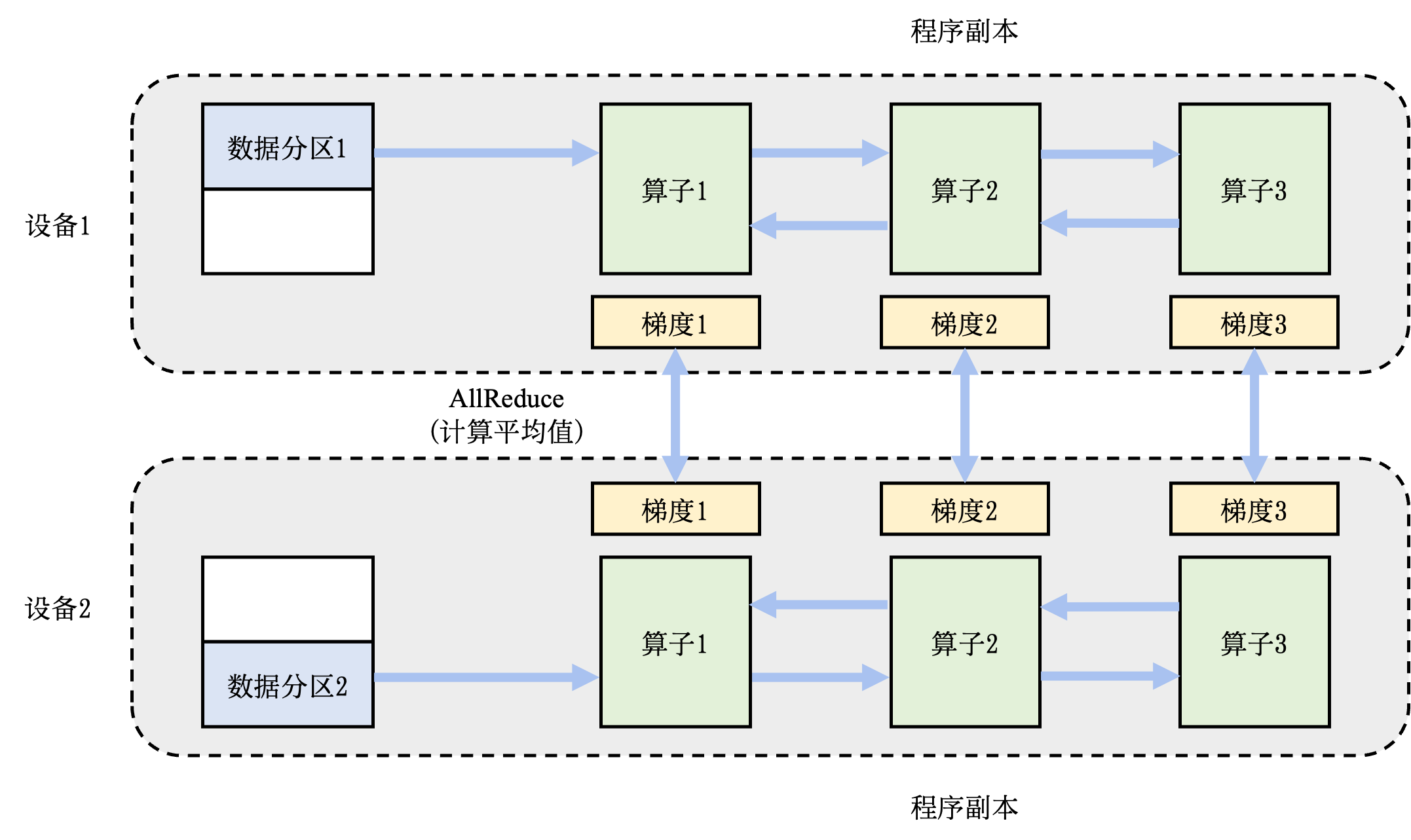 图11.2.2 展示了两个设备构成的数据并行训练系统(Data Parallel Training System)的例子。假设用户给定的数据批大小是64,那么每个设备会分配到32个训练样本,并且具有相同的神经网络参数(程序副本)。本地的训练样本会依次通过这个程序副本中的算子,完成前向计算和反向计算。在反向计算的过程中,程序副本会生成局部梯度。不同设备上对应的局部梯度(如设备1和设备2上各自的梯度1)会进行聚合,从而计算平均梯度。这个聚合的过程往往由集合通信的AllReduce操作完成。