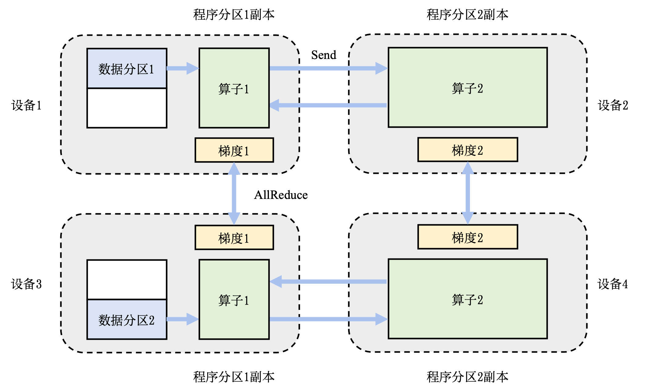 在训练大型人工智能模型中,往往会同时面对算力不足和内存不足的问题。因此,需要混合使用数据并行和模型并行,这种方法被称为混合并行。 图11.2.5 提供了一个由4个设备实现的混合并行的例子。在这个例子中,首先实现算子间并行解决训练程序内存开销过大的问题:该训练程序的算子1和算子2被分摊到了设备1和设备2上。进一步,通过数据并行添加设备3和设备4,提升系统算力。为了达到这一点,对训练数据进行分区(数据分区1和数据分区2),并将模型(算子1和算子2)分别复制到设备3和设备4。在前向计算的过程中,设备1和设备3上的算子1副本同时开始,计算结果分别发送(Send)给设备2和设备4完成算子2副本的计算。在反向计算中,设备2和设备4同时开始计算梯度,本地梯度通过AllReduce操作进行平均。反向计算传递到设备1和设备3上的算子1副本结束。