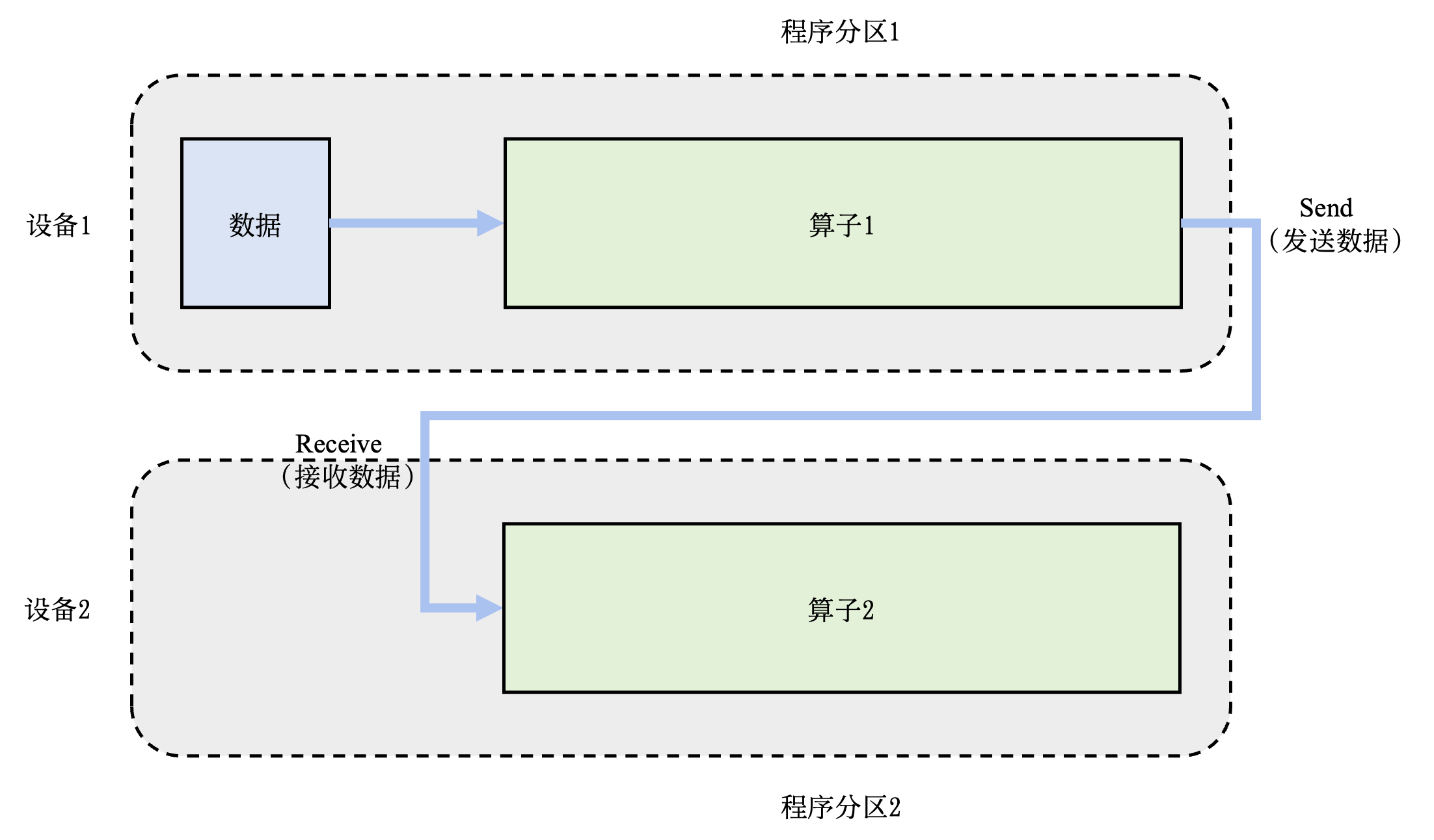 图11.2.4 给出了一个由两个设备实现的算子间并行的例子。在这个例子中,假设一个神经网络具有两个算子,算子1和算子2各自需要10GB的内存完成计算,则模型总共需要20GB的内存。而每个设备仅能提供10GB内存。在这个例子中,用户可以把算子1放置在设备1上,算子2放置在设备2上。在前向计算中,算子1的输出会被发送(Send)给下游的设备2。设备2接收(Receive)来自上游的数据,完成算子2的前向计算。在反向计算中,设备2将算子2的反向计算结果发送给设备1。设备1完成算子1的反向计算,完成本次小批次(Mini-Batch)的训练。