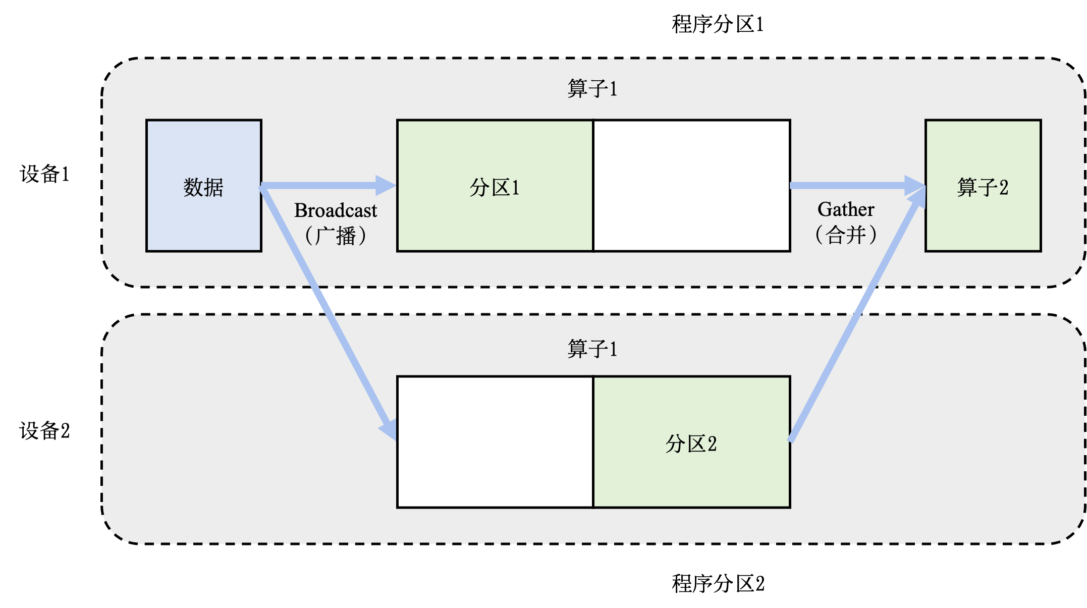 图11.2.3 给出了一个由两个设备实现的算子内并行的例子。在这个例子中,假设一个神经网络具有两个算子,算子1的计算(包含正向和反向计算)需要预留16GB的内存,算子2的计算需要预留1GB的内存。而本例中的设备最多可以提供10GB的内存。为了完成这个神经网络的训练,需要对算子1实现并行。具体做法是,将算子1的参数平均分区,设备1和设备2各负责其中部分算子1的参数。由于设备1和设备2的参数不同,因此它们各自负责程序分区1和程序分区2。在训练这个神经网络的过程中,训练数据(按照一个小批次的数量)会首先传给算子1。由于算子1的参数分别由两个设备负责,因此数据会被广播(Broadcast)给这两个设备。不同设备根据本地的参数分区完成前向计算,生成的本地计算结果需要进一步合并,发送给下游的算子2。在反向计算中,算子2的数据会被广播给设备1和设备2,这些设备根据本地的算子1分区各自完成局部的反向计算。计算结果进一步合并计算回数据,最终完成反向计算。