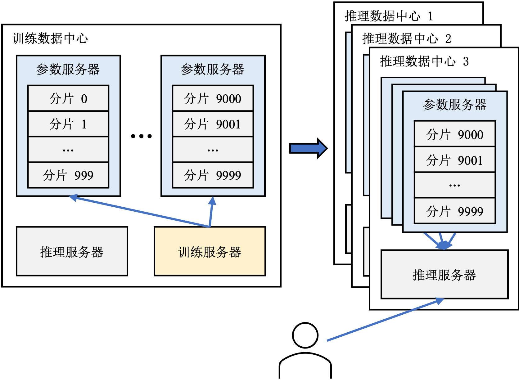 在推荐系统中,参数服务器除了协调训练过程,还要负责支持模型推理。在模型推理过程中,推理服务器需要访问参数服务器上的模型参数以计算推荐结果。因此为了降低推理过程的延迟,通常会在推理服务器所在的数据中心(以下称之为推理数据中心)中的参数服务器上保存至少一份模型参数的副本,结构如图 图13.1.4所示。这种做法还有利于容灾——当一个数据中心因为某些原因被迫下线无法访问时,可以将用户请求重定向至其他的推理数据中心。